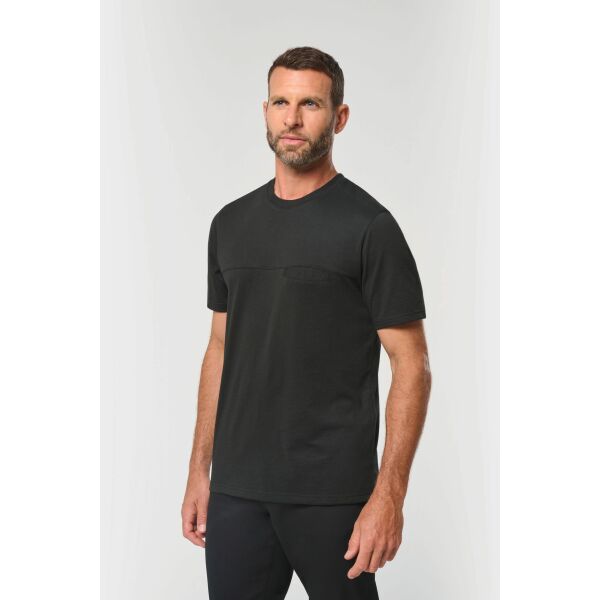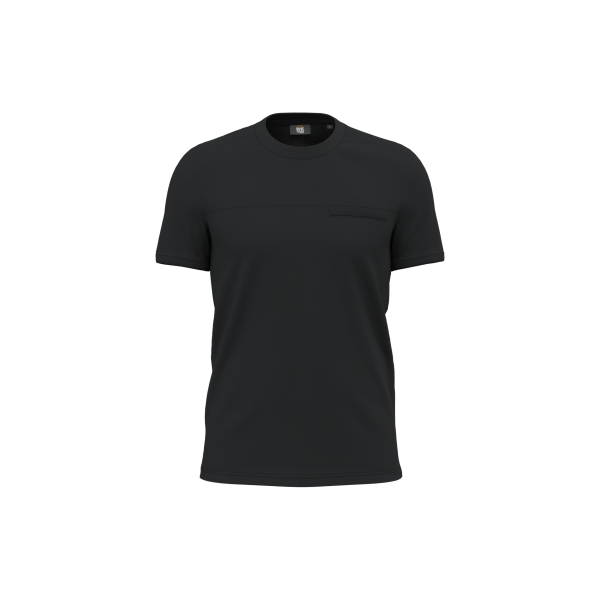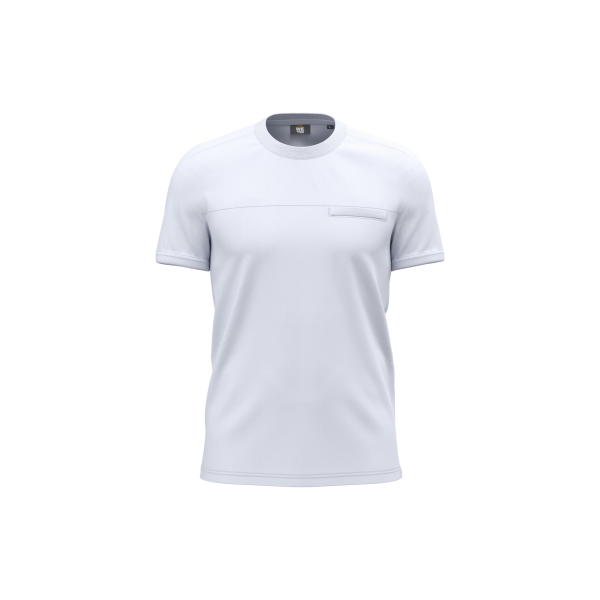 65% gerecycled polyester / 35% katoen. Jerseytricot. Industrieel en/of thuis wassen op 60°C. Rechte snit. Ronde hals met 1x1 ribboord en enkel sierstiksel. Ton-sur-ton nektape in jersey in de hals. Omzoomd borstzakje met sierstiksel aan de linkerkant voor de drager. Schouderversteviging aan de binnenkant in ton-sur-ton twillstof om vervorming tijdens industrieel wassen te voorkomen. Ademend inzetstuk op de rug in ton-sur-ton mesh. Zijsplitten. Dubbel stiksel aan mouwuiteinden en onderkant. RFID-zakje op de onderkant, op de etiketten. Afneembaar merklabel.
