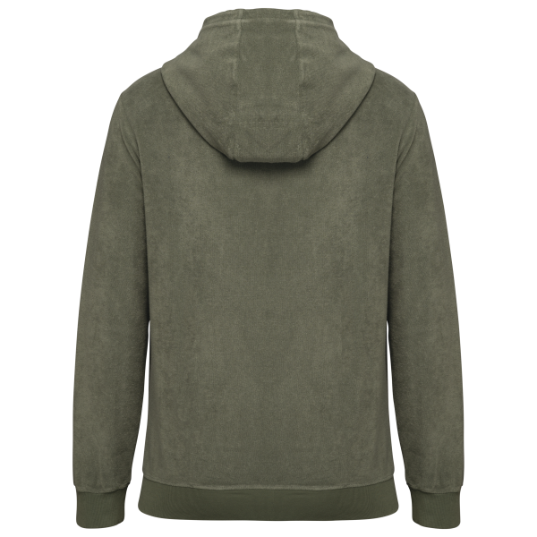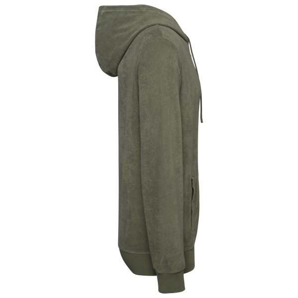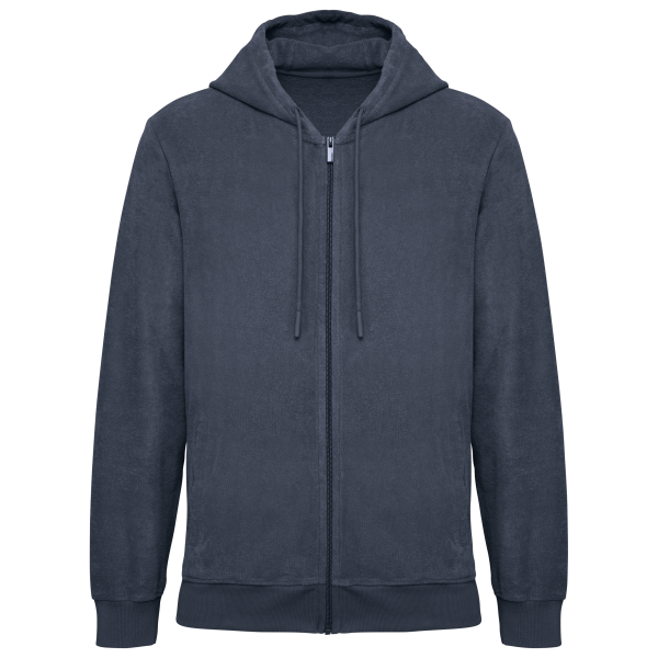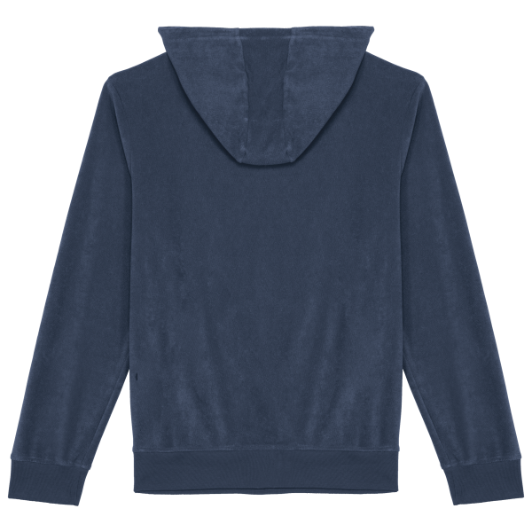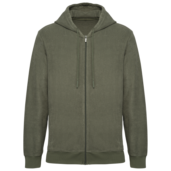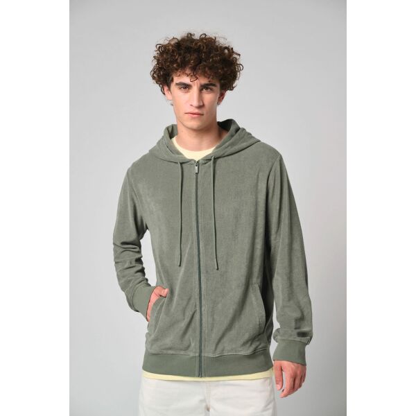 80% biologisch katoen / 20% post-consumer gerecycled polyester. Made in Portugal. Gekamd katoen. Badstof. Enzymgewassen. Rechte snit. Capuchon met 3 panelen, gevoerd met de hoofdstof. Rits van nylon en ritssluiting van ton-sur-ton gerecycled metaal. Twee omzoomde zakken op de voorkant met biesstiksel. Hals, mouwuiteinden en onderkant in 1x1 ribboord. Ton sur ton visgraat nekband afwerking. Geborduurde verluchtingsgaatjes. Rond aanrijgkoordje van biokatoen en uiteinde van ton-sur-ton silicone. Halsopening, mouwuiteinden en onderkant met stiksel. Schouderversteviging. Halvemaan op de achterkant.